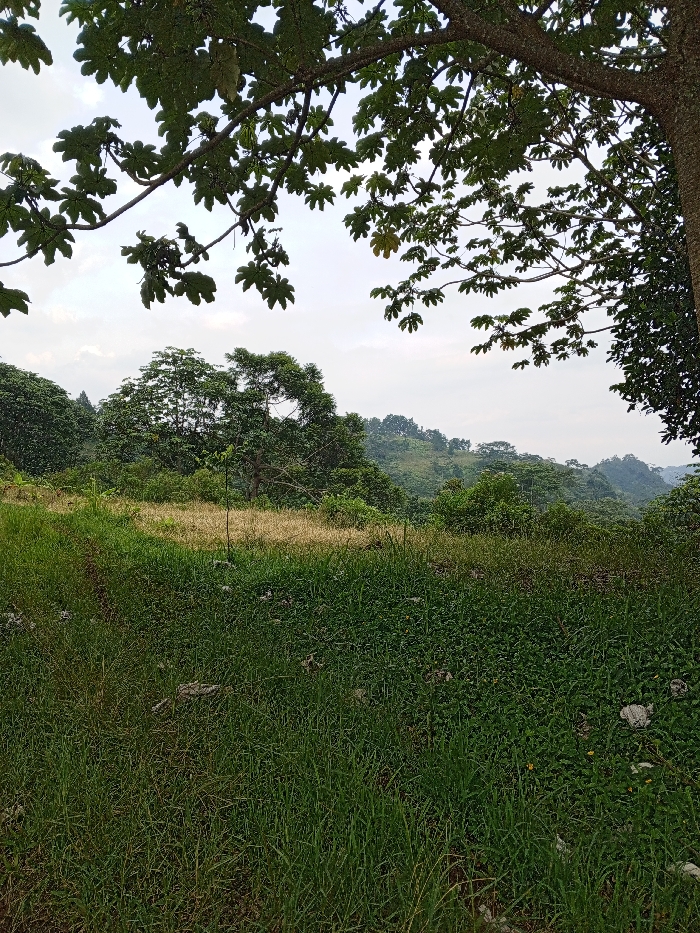 The image displays an outdoor, natural landscape situated in Thotagamuwa, Sri Lanka. The scene presents a densely vegetated environment under an overcast, light grey sky. In the immediate foreground, dark green ground cover and taller green grasses are observed, interspersed with scattered light-colored debris. A strip of lighter, drier grass extends horizontally across the midground. Beyond this, the background consists of a heavily forested area with numerous trees forming dense canopies. Distant hills, similarly covered in green foliage, are visible on the horizon. A large tree branch with prominent palmate leaves extends from the upper left across the top of the frame, partially framing the sky. A tree trunk is visible on the far right side of the frame. No individuals, animals, or active interactions are present in the depicted scene.