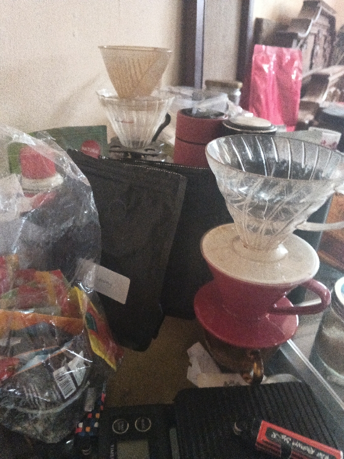 The image depicts a static indoor scene on a cluttered surface, likely a table or counter, in Dogsenang Gorphoog, Bhutan. The primary subjects are various items associated with manual coffee brewing. In the center, two conical pour-over coffee drippers are stacked; the upper one is an amber-toned plastic or glass, resting on a clear ribbed glass dripper, which is positioned on a black stand or scale. To the right, a clear ribbed glass dripper sits on a white ceramic collar, which then rests on a red ceramic mug or brewer with a handle. To the far left in the foreground, a transparent plastic bag contains multiple individually packaged, colorful snack items. A small, white rectangular label is affixed to this bag. Behind this, a flat black pouch or bag stands upright. In the bottom center, a black digital scale, partially legible as "TIMEMORE" or similar, is present on a clear glass surface. To its immediate right, a small red rectangular box with white lettering is also on the glass surface. In the mid-ground, behind the central stacked drippers, a stack of red cylindrical objects, possibly a manual coffee grinder or storage containers, is visible. Further in the background, a bright pink or red flexible bag, likely containing coffee beans, stands upright. The background consists of a light-colored wall and indistinct darker elements, possibly furniture or shelves. No individuals are present in the scene, and no explicit actions are occurring. The environment suggests an active coffee preparation area.