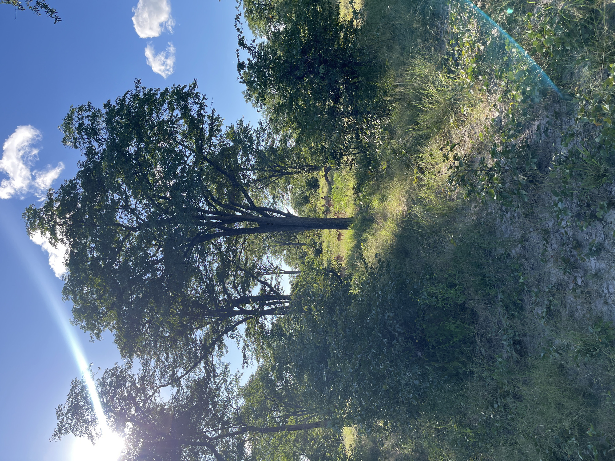 The image depicts a natural landscape in Khwai, Botswana. The sky is blue with scattered white clouds, and sunlight streams through the trees, creating lens flare in the lower-left corner. The foreground and midground consist of dense vegetation, including trees, bushes, and tall grass. In the midground, a small group of animals, possibly deer or antelope, is partially obscured by the foliage. The ground appears sandy or dusty in some areas. The scene is generally green and bright, with the sky visible through the tree canopy.
