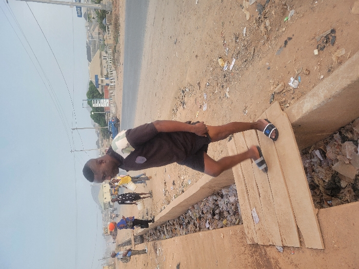 An outdoor urban scene in Suleja, Nigeria, depicts a paved road bordered by unpaved dirt shoulders and an open concrete drainage ditch
