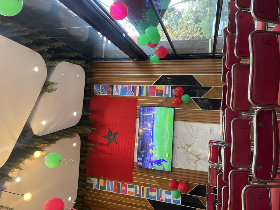 This image displays the interior of a commercial viewing area, likely a cafe or communal space, located in Salé, Morocco