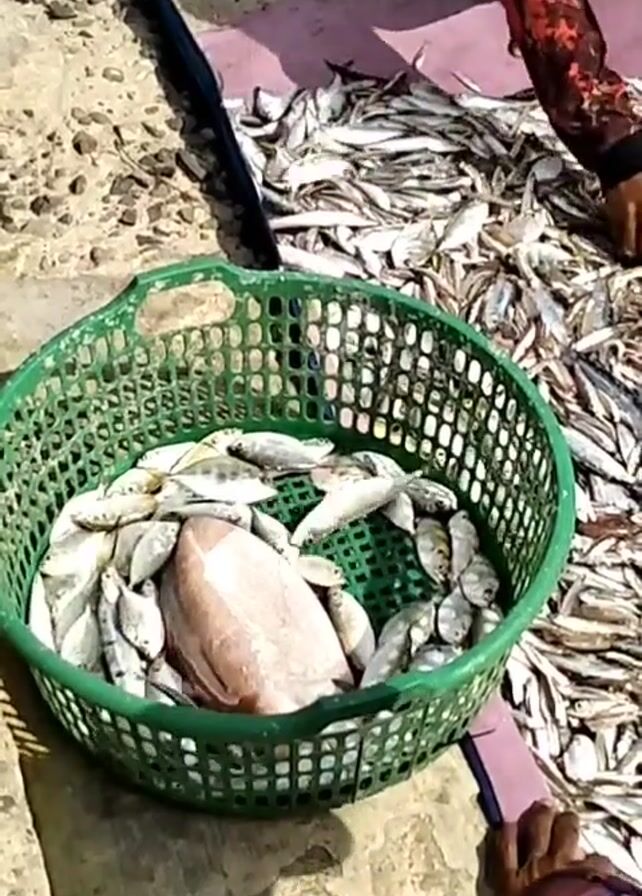 A group of men is processing a large quantity of small fish on what appears to be a rocky beach