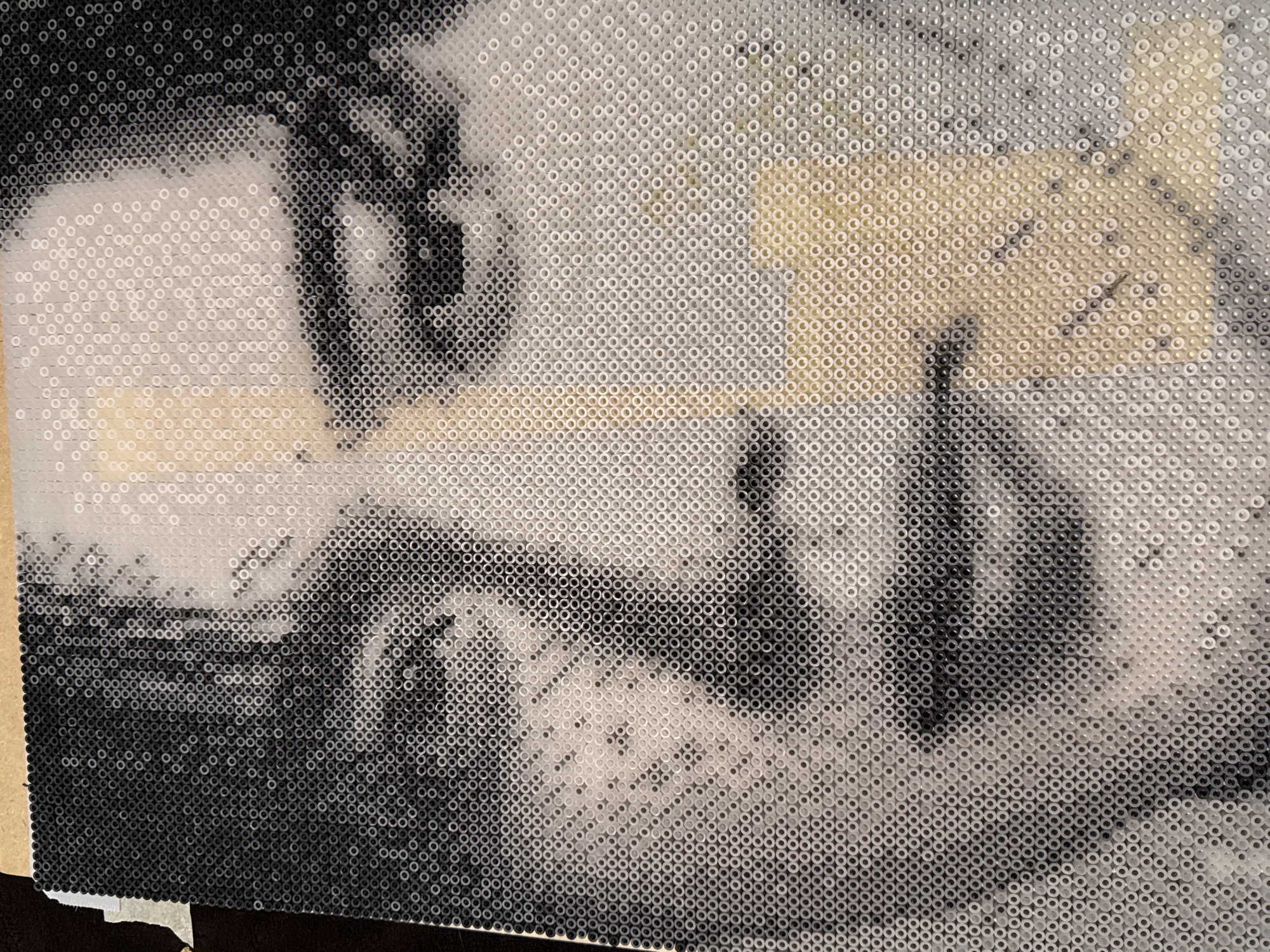The image is a close-up of a pixelated portrait, resembling a face rendered using small, circular beads