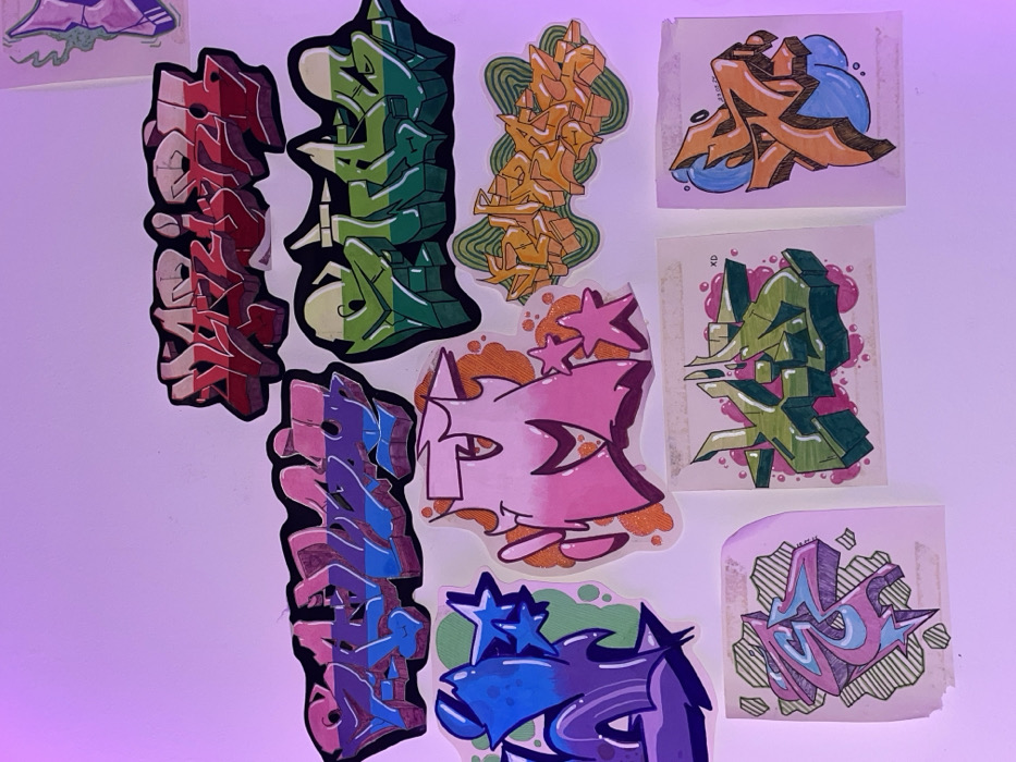 A collection of colorful graffiti stickers are arranged on a white surface with a purple hue