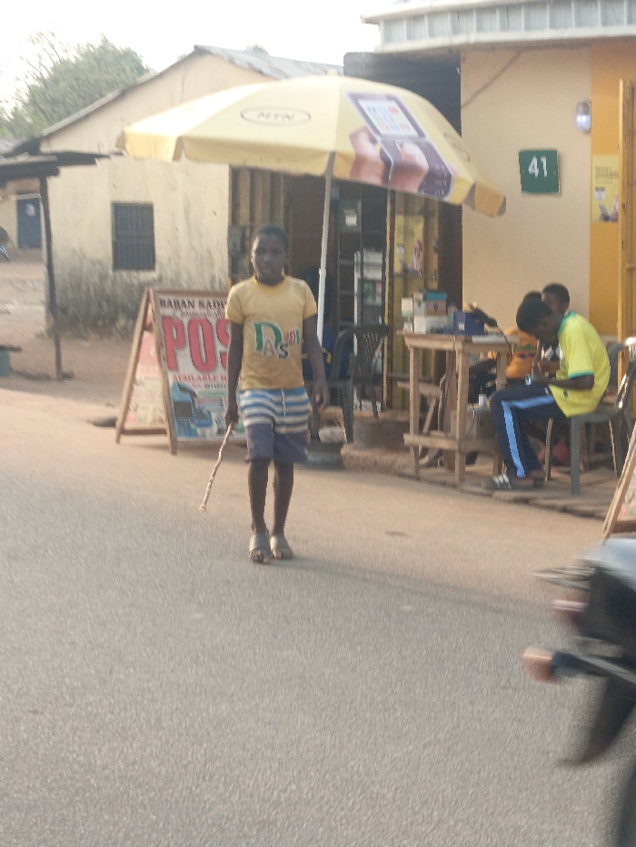 The image depicts a street scene in Akwanga, Nigeria. In the foreground, a young male, approximately 8-12 years old, stands centrally on an asphalt road. He wears a yellow t-shirt with a green and white "D'AS" logo, horizontally striped blue and white shorts, and light-colored sandals. He holds a slender, light-brown stick in his right hand, extending downwards. His gaze is directed forward. In the midground, to the boy's left, a sandwich board sign stands on the pavement, displaying red text that includes "POS" and "AVAILABLE HERE." Behind the sign, a light-colored building with a dark window is visible. To the boy's right, a light yellow commercial building with the green numeral "41" affixed to its facade is present. A large yellow MTN-branded umbrella extends from this building, featuring an image of a hand holding a mobile device. Beneath the umbrella, a wooden table is set up, behind which two individuals are seated. One individual, wearing a yellow t-shirt and blue track pants with a light blue stripe, is partially visible and appears to be interacting with an object on the table. The background shows a hazy sky above distant trees and buildings. A blurred dark object, possibly part of a vehicle, is visible in the bottom right corner of the frame. The scene is illuminated by natural daylight.