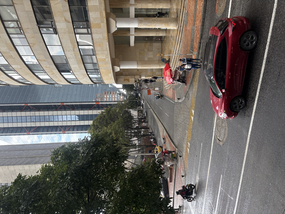 An urban scene features modern architecture with mirrored glass buildings and a tan-colored building supported by columns. A red car is parked on the street. People are gathered near a red umbrella at the corner of the tan building. The street is lined with trees, and motorcycles are visible, suggesting a busy city environment. The overall view is from a high angle, capturing the depth and activity of the city street.