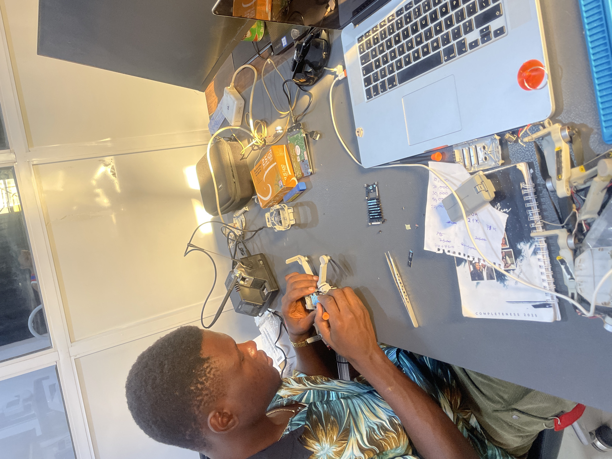 An adult male with dark skin and short dark hair, wearing a patterned blue, green, and brown short-sleeved shirt and olive green trousers, is meticulously working on disassembling a white quadcopter drone with a small orange-handled tool. He is seated at a dark grey table that is covered with various electronic components, tools, and accessories. These include a black soldering station with an iron, fine-tipped tweezers, several circuit boards (one with a heat sink), an orange box labeled "2.5 HDD," a bare hard drive platter, and multiple cables connecting different devices. A silver-colored laptop, open to its keyboard, is positioned on the right side of the table, alongside a black computer mouse and a white USB hub. Various notebooks, one labeled "COMPLETENESS 2025," are also visible on the table. The workspace features white walls and windows in the background, with warm sunlight illuminating the scene from the left. This scene depicts an electronics repair or development activity within a workspace located in Jos, Nigeria.