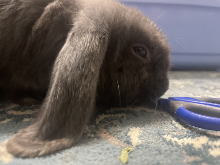 - "A gray lop-eared rabbit rests on a blue carpet" by FM-PwRFu2, licensed under CC BY 4.0
