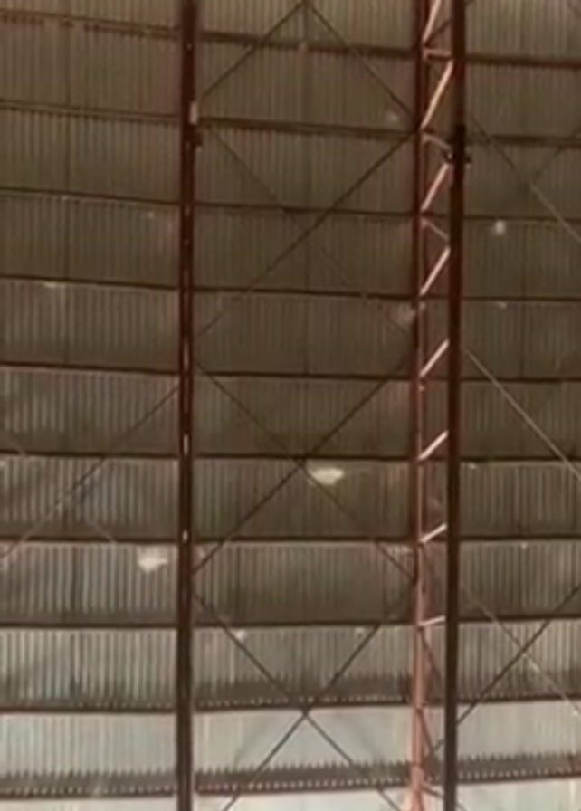 The camera is pointed up at the roof of a large, indoor structure. The roof is made of corrugated metal and is supported by metal beams and crossbeams. Light is coming through the roof, and there are a few light fixtures visible. The camera pans down to show a white wall and a person sitting in the corner. The person is wearing dark clothing and has their legs crossed. There is some background noise.