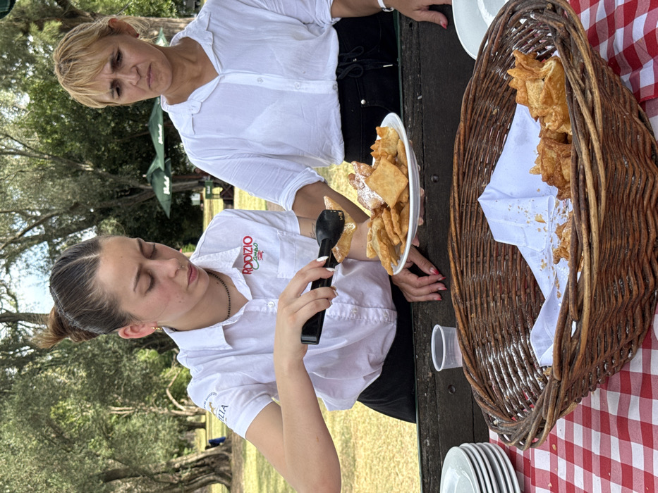 Two women wearing white button-down shirts stand near a picnic table. The younger woman, with a Rodizio Grill logo on her shirt, uses tongs to move fried pastries from a plate. A wicker basket lined with a white cloth is filled with similar pastries. Plates and a disposable cup sit on the checkered tablecloth. Outdoor trees and grass are visible in the background.