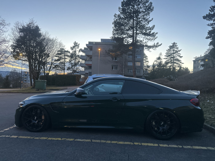 The image depicts an outdoor parking area in Volketswil, Switzerland, during twilight hours. A dark green two-door coupe, identified as a BMW M4, is centrally parked on a dark asphalt surface featuring faded yellow parking lines. The vehicle is oriented to the left, equipped with black multi-spoke BBS wheels and an aftermarket white lip spoiler on the trunk lid. In the mid-ground, behind and to the right of the BMW, part of a light-colored vehicle, likely an SUV or wagon, is partially visible. The background features several multi-story apartment buildings of varying architectural styles. One prominent building on the right exhibits multiple balconies and several illuminated windows. Clusters of trees, including both bare deciduous trees and tall coniferous trees, are scattered throughout the scene. A green industrial-style dumpster is positioned on the left side of the frame, near a street lamp that emits an orange glow. An earthen embankment covered with dry vegetation rises on the far right. No individuals, actions, or interactions are discernible.