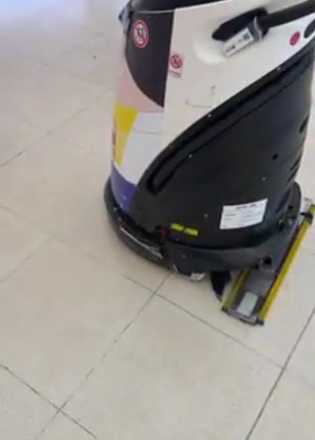 white and black floor-cleaning robot moving on a tiled floor. The robot has a cylindrical body, and its side is decorated with a cartoon graphic of a winking boy in a white and purple uniform. The floor is light-colored, and some seams between the tiles are dark. A person in black pants and shoes walks by in the background. The robot moves forward, cleaning the floor.