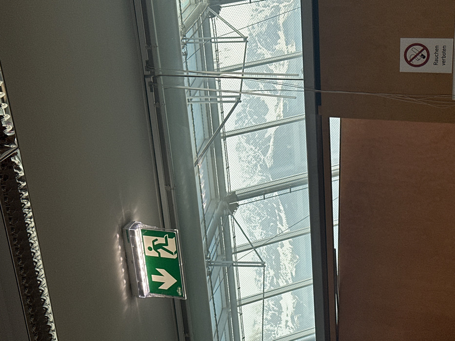 The image presents an interior view within a modern building in Innsbruck, Austria, offering a panoramic outlook towards snow-capped mountains, consistent with a Hungerburgbahn funicular station. The light gray ceiling features a centrally mounted, illuminated green exit sign displaying a white running figure and a downward arrow, marked with a "din" logo. A reflective, serrated trim runs along the upper edge of the ceiling. Below this, large, angled glass panels form the primary external wall, revealing distant, snow-covered Alpine peaks under a light sky. The glass incorporates a grid or mesh pattern. Several thin, transparent rods or cables hang vertically on the right side, seemingly integrated with the window structure. The lower section of the image shows a plain brown wall or partition. A circular "Rauchen verboten" (No Smoking) sign, depicting a crossed-out cigarette, is affixed to this brown surface in the lower right corner. No individuals are present in the scene.