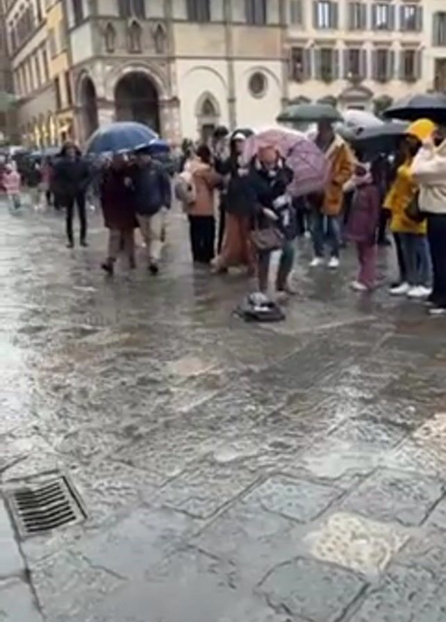 street scene with a crowd of people walking in the rain. Most of them are using umbrellas. In the center of the frame, a street performer is putting on a show, wearing silvery shoes and dancing with them. Several people are gathered to watch the performance. The ground is wet and slick with rainwater, and the buildings lining the street are classic European architecture. A storm drain is visible in the foreground.