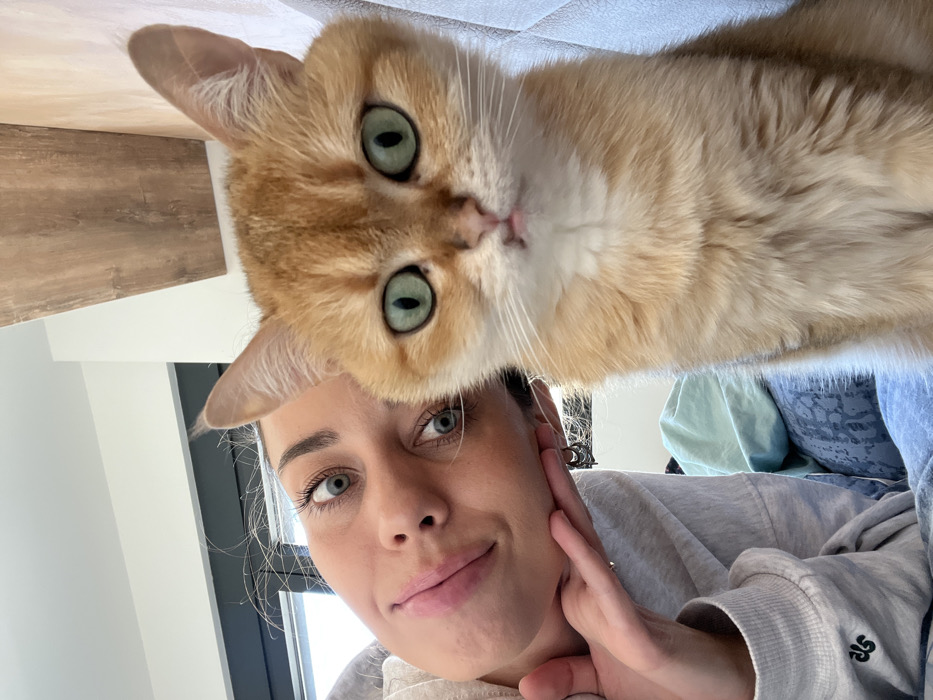 This image, captured in Bar, Montenegro, displays a close-up, eye-level indoor scene featuring one female individual and one feline. On the left side of the frame, a female with a light complexion, dark eyebrows, and prominent blue-green eyes is present. Her head is tilted, exhibiting a slight smirk, and she is attired in a light grey hooded sweatshirt with a dark emblem on the sleeve. Her left hand, featuring a silver ring on the ring finger and small silver hoop earrings, rests beneath her chin. Adjacent to the right, a domestic cat with predominantly golden-orange fur and white markings on its chest and muzzle is present. The cat possesses large, vibrant green eyes and a pink nose, with a minimal protrusion of its pink tongue. It faces directly forward. The immediate background consists of a bright white ceiling and wall section in the upper left, a dark window or door frame admitting daylight behind the individual, and a vertical wood-paneled wall section in the upper right. Below the subjects, light-colored soft furnishings, including segments of teal and patterned blue fabric, are visible. The setting is consistent with an indoor domestic environment.