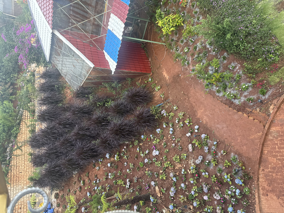The image depicts a cultivated garden on a sloping hillside in Đa Bla, Vietnam. The ground predominantly consists of reddish-brown soil. The upper left slope features dense clusters of dark purple ornamental grass planted in terraced sections. Below these, small hydrangeas with blue, purple, and white blooms are scattered across the left slope. A brick pathway, constructed from terracotta-colored bricks, branches through the garden, with one segment descending from the center and another curving along the lower edge of the frame. On the right, a greenhouse structure stands, featuring a lower section with red corrugated metal siding and an upper section with transparent panels. An attached awning, composed of alternating blue, white, and red corrugated metal panels, extends from the greenhouse. A coiled garden hose is present on the ground near the awning. The lower right section of the garden contains smaller green plants interspersed with white and red flowers, along with a compact evergreen shrub. Small white irrigation emitters are visible among these plants. In the background, a brick retaining wall supports the upper hillside, which is covered with green foliage and trees, including some with purple flowers. A curved, coiled metal element is partially visible in the upper left foreground. No individuals or specific actions are observed.