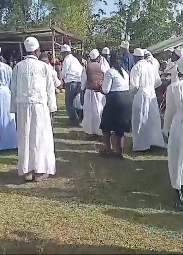 A gathering of people is taking place on a grassy field. The majority of the attendees are wearing white robes and head coverings. Some individuals are dressed in casual clothing like jeans, t-shirts, and vests. People are dancing and clapping to the music. The background includes trees and a building with a green roof. Some individuals are recording the event with their phones.