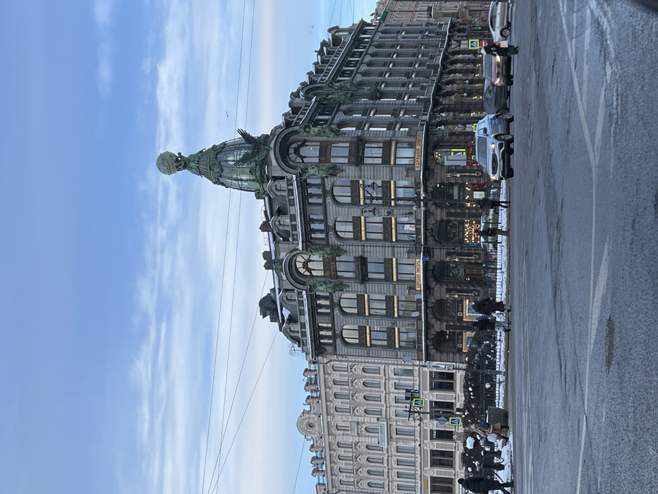 - "The image depicts a wide-angle view of the Singer House (Dom Knigi), an ornate seven-story Art Nouveau building with a distinctive green-patinated bronze and glass dome topped by an eagle sculpture holding a globe, located at the intersection of Nevsky Prospekt and the Griboyedov Canal Embankment in Saint Petersburg, Russia" by FM-6LnVy2, licensed under CC BY 4.0