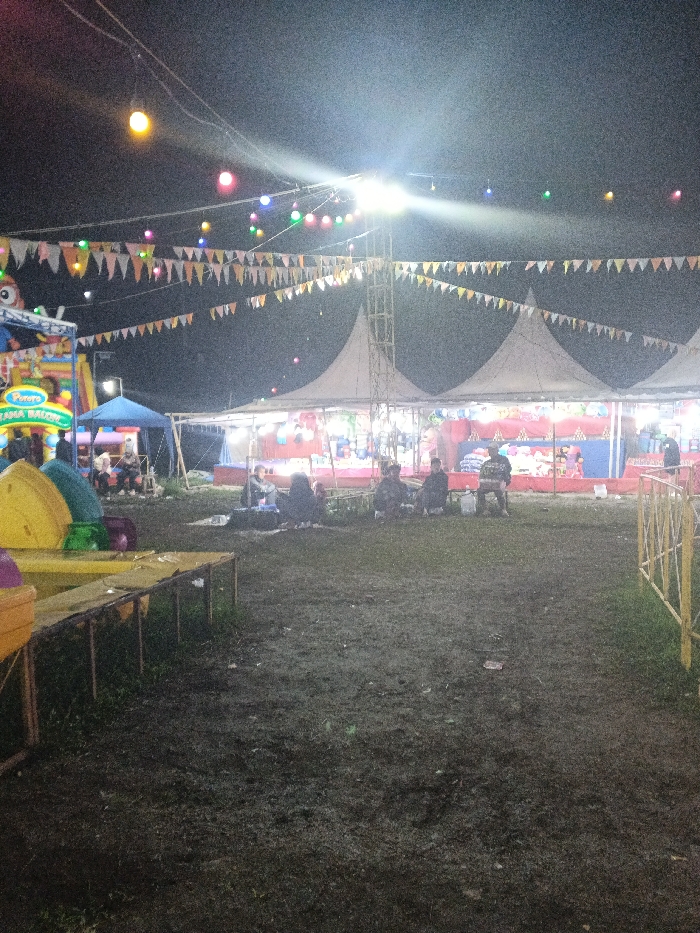 An outdoor fair at night features white tents illuminated by bright lights, strung with colorful pennants. People sit on the ground in front of the tents. A bouncy castle stands to the left. The ground appears muddy. String lights and colored bulbs hang above. Tables are visible in the foreground. A metal fence is on the right.