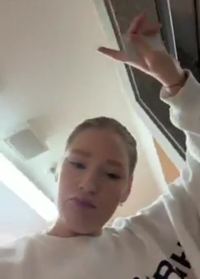 A young woman with blonde hair tied back into a ponytail stands indoors, possibly in a restroom, wearing a white "Pittsburgh" sweatshirt. She is holding a small, white rectangular object in her right hand above her head, moving it to the side as she turns. She makes a kissing face toward the camera. The background includes a white ceiling with a fluorescent light, a vent, and a smoke detector. The overall lighting in the room is bright.