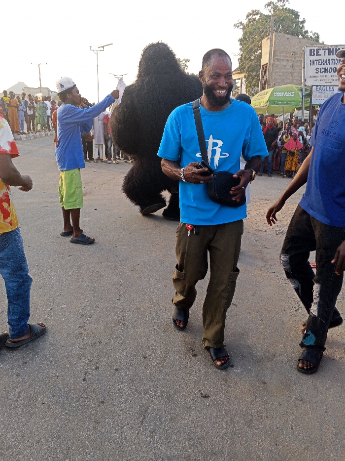 The image depicts an outdoor public gathering on an asphalt road in Zango-ndaji, Nigeria. In the foreground, a bearded African male with a visible smile is walking towards the viewer's right, wearing a light blue t-shirt with a white stylized "P" logo (resembling a Houston Rockets emblem), brown cargo pants, black slide sandals, a silver chain bracelet on his left wrist, and a black cross-body bag. He holds a dark object, possibly a mobile phone, with both hands. Behind him, a person in a large, dark black gorilla costume is positioned slightly to the left, facing towards the left. To the left of the gorilla costume, another African male is standing, wearing a light blue long-sleeved shirt, lime green shorts, black slide sandals, and a white baseball cap. He holds a black microphone in his right hand, pointed forward, and a white sheet of paper in his left hand. Various other individuals populate the background. A crowd of people, including women in hijabs and children, are visible along the side of the road and standing on a concrete curb, observing the activity. Buildings are present in the background, including one featuring a white sign that reads "BETHEL INTERNATIONAL SCHOOL." Other commercial elements include green market umbrellas and a sign partially visible as "PRIME DATA." Streetlights with solar panels are also visible. The overall scene suggests a public performance or event.