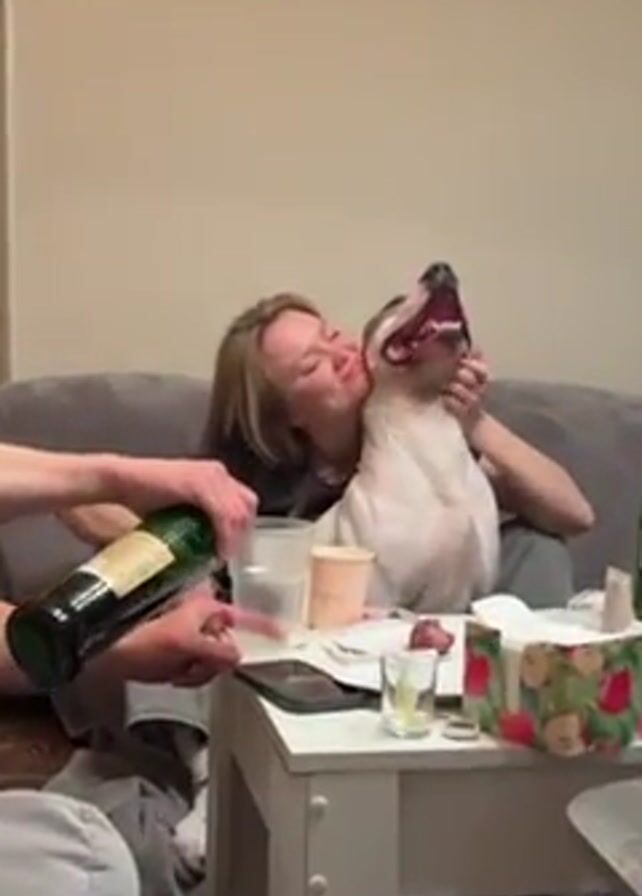 A medium shot depicts a casual indoor scene of relaxation and camaraderie. On a gray sofa, a blond woman affectionately embraces a happy-looking white and gray dog, their faces close. She kisses the dog’s cheek while holding it. In the foreground, a person’s hands pour a dark liquid from a green bottle into a clear plastic cup on a white table. The table is cluttered with various items: a pink disposable coffee cup, a smartphone, shot glasses, some wrapped food in a strawberry-patterned container, and a plate of food on a nearby table. A green beer bottle rests beside the wrapped food. The background features a plain beige wall and a closed white door. The music is a lively dance beat.