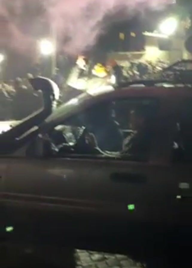 At night, the video shows a crowd of people gathered around a car with a large exhaust pipe. The car is silver and has a rack on top. Someone is sitting on top of the car, holding a red smoke grenade. The crowd is cheering and taking pictures. The car is moving slowly through the crowd, which appears excited. There are lights on in the background. The video then cuts to the side of a tractor trailer off the side of the road at night. The back end of the trailer is visible, with taillights illuminated. There are people in the background. The final shot in the video is of the car from the beginning driving away, followed by the crowd.