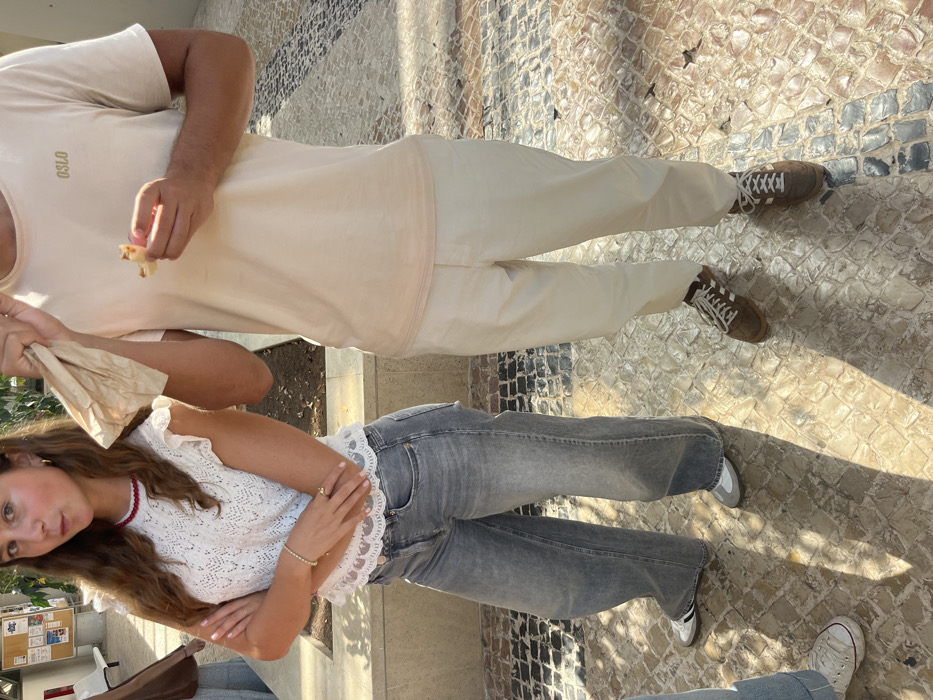 The image depicts an outdoor scene in Oeiras, Portugal, specifically on a public walkway paved with traditional Portuguese mosaic cobblestones (calçada portuguesa) exhibiting light and dark irregular patterns. In the foreground, two individuals are standing. On the left, a young female with long brown hair, wearing a white lace-patterned top with ruffled sleeves, a red choker, gray wide-leg jeans, and white sneakers with black stripes. Her arms are crossed, and she wears a light-colored beaded bracelet and a ring on her right hand. She looks towards the camera with a neutral expression. To her right, a young male is partially visible, wearing a light beige t-shirt with "OSLO" embroidered on the left chest, light beige trousers, and brown suede sneakers with white stripes and laces. He holds a crumpled light brown paper bag in his right hand and a partially eaten pastry or food item with a pink filling in his left hand. A third individual's lower legs and feet, wearing light blue jeans and white canvas shoes, are visible on the far left. Behind the two main figures, a low, light-colored concrete or stone planter wall is present. Beyond the wall, there is dark soil with some sparse green vegetation. In the background, out of focus, a building with white walls and a bulletin board displaying several posters is discernible, along with a partially visible white bench. The scene is brightly lit by natural sunlight, casting elongated shadows on the cobblestone pavement.