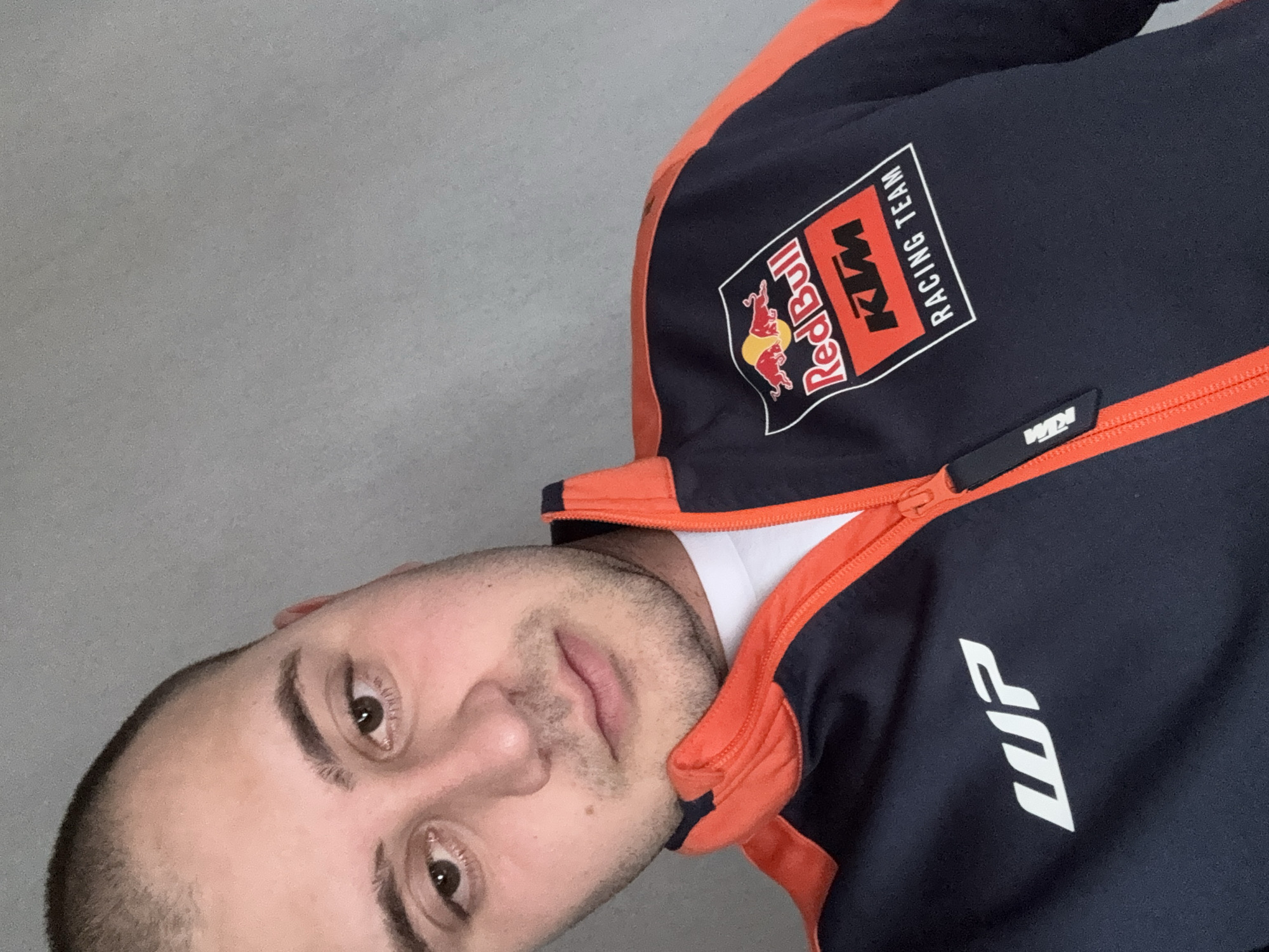 A male individual with closely cropped dark hair and light facial stubble is depicted in a selfie-style photograph. He has brown eyes and a neutral facial expression. The subject is wearing a navy blue zip-up jacket with orange accents along the shoulders and zipper, over a white crew-neck shirt. The jacket features a "Red Bull KTM RACING TEAM" patch on the upper right chest area (viewer's left) and a white "WP" logo on the upper left chest area (viewer's right). A small "KTM" logo is visible on the zipper pull tab. The background is a plain, light grey, uniform surface, indicating an indoor setting. The specific location within the city of Samokov, Bulgaria, cannot be determined from the visual information provided.