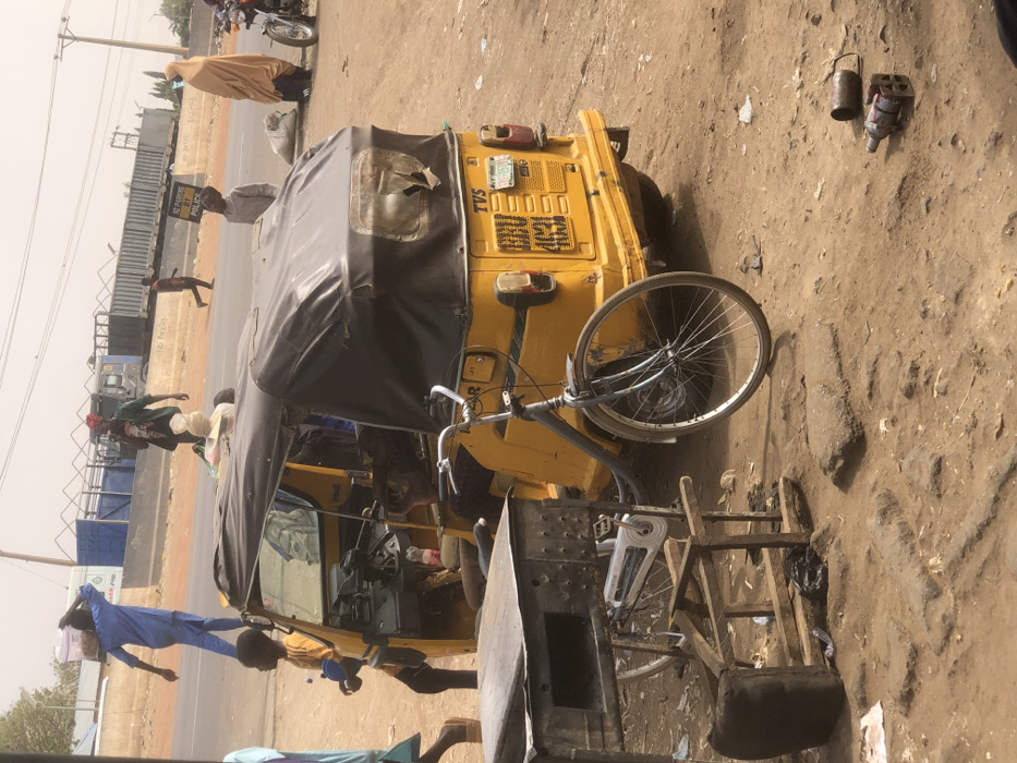 The scene depicts a dry, dusty roadside environment in Tukur Tukur, Nigeria, under a hazy sky. In the foreground, a yellow TVS brand motorized tricycle with a black fabric canopy is parked on a dirt shoulder. The tricycle's rear window is torn, and its license plate reads "BNU 403JL". A grey bicycle with white rims leans against a black metal stand that appears to incorporate a sewing machine mechanism. Next to this stand lies a broken wooden chair frame with a black cushion attached. Scattered debris, including plastic bottles and metal objects, is present on the dirt ground. A young boy in a yellow shirt and dark trousers stands near the open front of the tricycle, holding a blue object. A person in light blue attire is partially visible on the far left. In the midground, an asphalt road runs horizontally, separated from the dirt shoulder by a concrete barrier. On or near the road, several individuals are observed: a man in a blue tunic carries a white bucket on his head, walking left; another man in a dark green shirt and red cap carries a white bag over his right shoulder; a child in a light-colored shirt stands near a white sign displaying "NO PARKING BY POLICE," looking towards the viewer. Further right, a person cloaked in a light brown full-body garment stands beside a parked motorcycle. In the distant background, a large truck is visible on the road, accompanied by utility poles and overhead power lines.