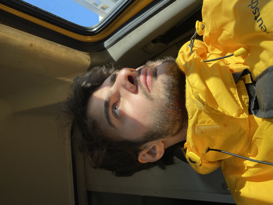 A young adult male subject, with dark hair and a beard, is situated within a vehicle interior in Nuremberg, Germany. He wears a bright yellow jacket featuring a black drawstring with yellow toggles and a partial "Deutsch" logo on the lower right front. The subject gazes upwards and to the right. Direct sunlight illuminates the right side of his face and the upper portion of his jacket. The vehicle's interior ceiling is light-colored and shows signs of wear. Through the right-side window, a clear blue sky and a segment of a light-colored building with windows are discernible. The window frame is yellow with a black rubber seal.