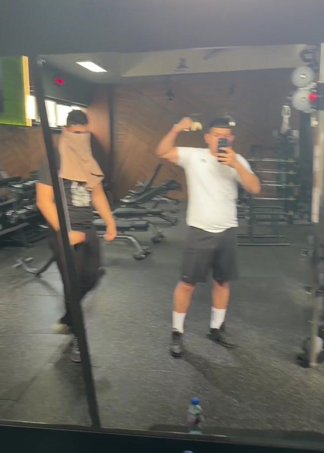 A mirror in a gym reflects two young men posing. One man wears black pants, a black shirt, and a towel over his face. He flexes his arm and clenches his fist. The other man wears a white shirt and black shorts. He flexes his arm while holding a phone. Gym equipment, weights, and a water bottle are visible in the gym. The camera pans over a mirror showing resistance bands and other equipment.