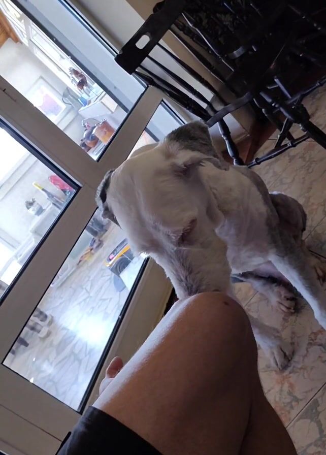 A first-person shot depicts a person seated, facing a glass door, interacting with a dog