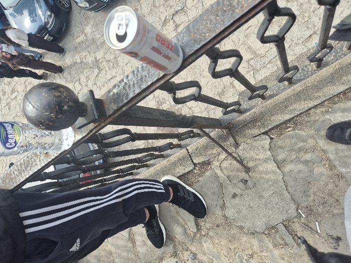 A high-angle view captures an urban scene in Veliko Tarnovo, Bulgaria. In the immediate foreground, the lower body and legs of an individual are visible on the left, wearing dark blue Adidas track pants with three white stripes and black Adidas Ultra Boost athletic shoes. Another pair of black athletic shoes is partially visible at the bottom right. A weathered dark metal railing with a spherical finial and ornate vertical bars runs across the image. An open silver Red Bull Zero energy drink can is resting horizontally on the top bar of this railing. Below the railing, the ground consists of irregular, worn stone paving with dirt and several white cigarette butts. In the midground, beyond the railing, at least four individuals are standing on a paved surface. One person wears a dark brown tracksuit, another a light-colored top and dark pants, and a third a dark jacket. A clear plastic bottle of Selana water stands upright on the paved surface. Two vehicles are parked in the background: a dark blue Volkswagen Golf and part of another dark-colored car. The scene depicts an outdoor urban setting, likely a street or public area.