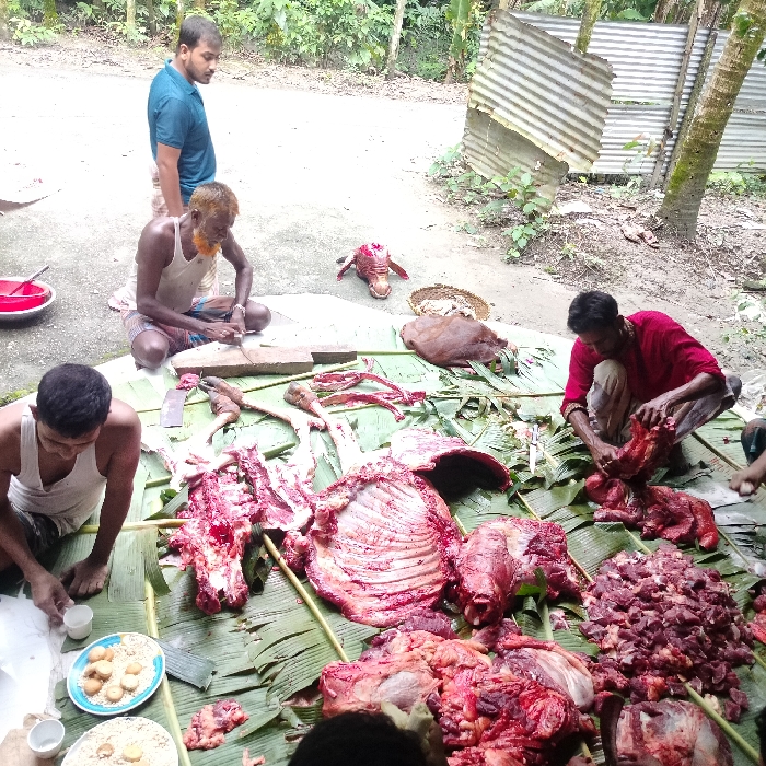 The image depicts a scene of butchery in Lalmohan, Bangladesh (coordinates: 22