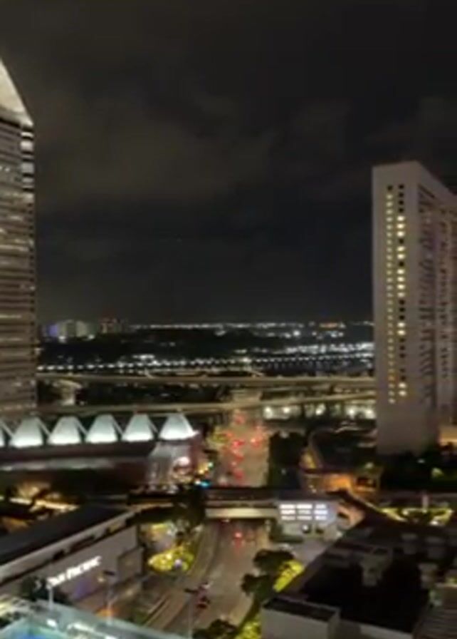panoramic view of the Singapore skyline at night. The camera pans from left to right, revealing several tall buildings, a large observation wheel (the Singapore Flyer), and the iconic Marina Bay Sands complex. The city is brightly lit, with roads illuminated by car headlights and buildings glowing with artificial light. The night sky is partially covered by clouds. Below the camera's vantage point, there are tennis courts and other structures, suggesting a high-rise setting like a hotel or apartment.