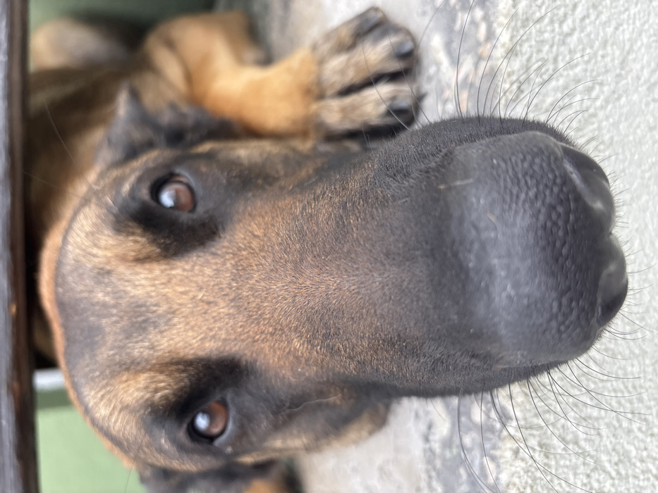 The image displays a close-up, low-angle perspective of a domestic dog, consistent with a Belgian Malinois breed, in Botevgrad, Bulgaria. The dog is in a prone position on a light-colored, textured ground surface, with its head and muzzle central to the frame. Its black nasal planum is prominent, with numerous long whiskers extending laterally. The dog's dark brown eyes exhibit specular highlights, indicating an ambient light source, and are directed towards the viewer. The pelage is a fawn-to-tan color with a dark blackish-brown overlay, particularly noticeable around the muzzle and eyes. Blurred elements in the background include the dog's forepaws, a dark horizontal linear object, and a diffuse light green surface.
