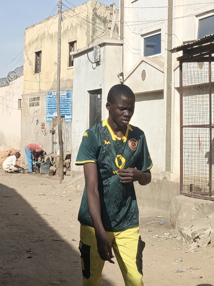 A young man is in the foreground wearing a green and yellow soccer jersey and yellow pants with black patches. He is standing on a dirt street in front of buildings. Two people are in the background on the left of the image, near a water source, washing. The buildings appear to be in disrepair. One has a metal grated door. Wires are running overhead near the buildings.