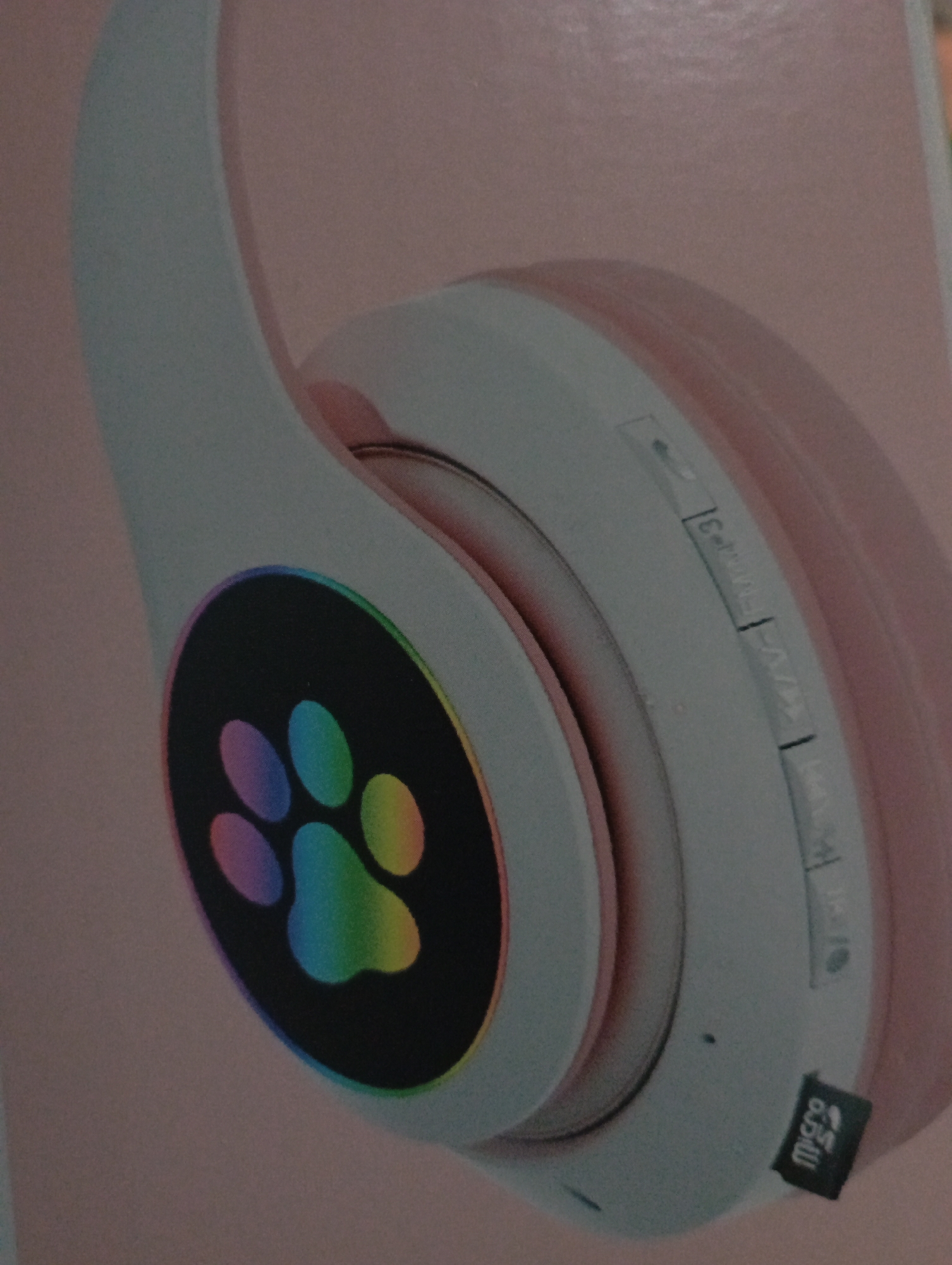An image displays a close-up of a single ear cup from a pair of over-ear headphones, angled against a plain, light pink background. The headphones are primarily white or light grey with pink accents visible on the inner rim of the ear cup and possibly parts of the headband. The visible ear cup features a circular, black, glossy panel with an illuminated paw print icon. The paw print exhibits a rainbow gradient, with individual pads displaying distinct colors such as blue, green, yellow, orange, and pink. Along the outer edge of the ear cup, several controls are visible, including buttons or sliders marked with symbols for power, play/pause, volume/track navigation. A black micro SD card is partially inserted into a slot on the lower edge of the ear cup, with "micro SD" text visible on its surface. The image does not contain any visual information to determine a specific geographical location, including the city of Kurganinsk, Russia. No people are present in the scene.