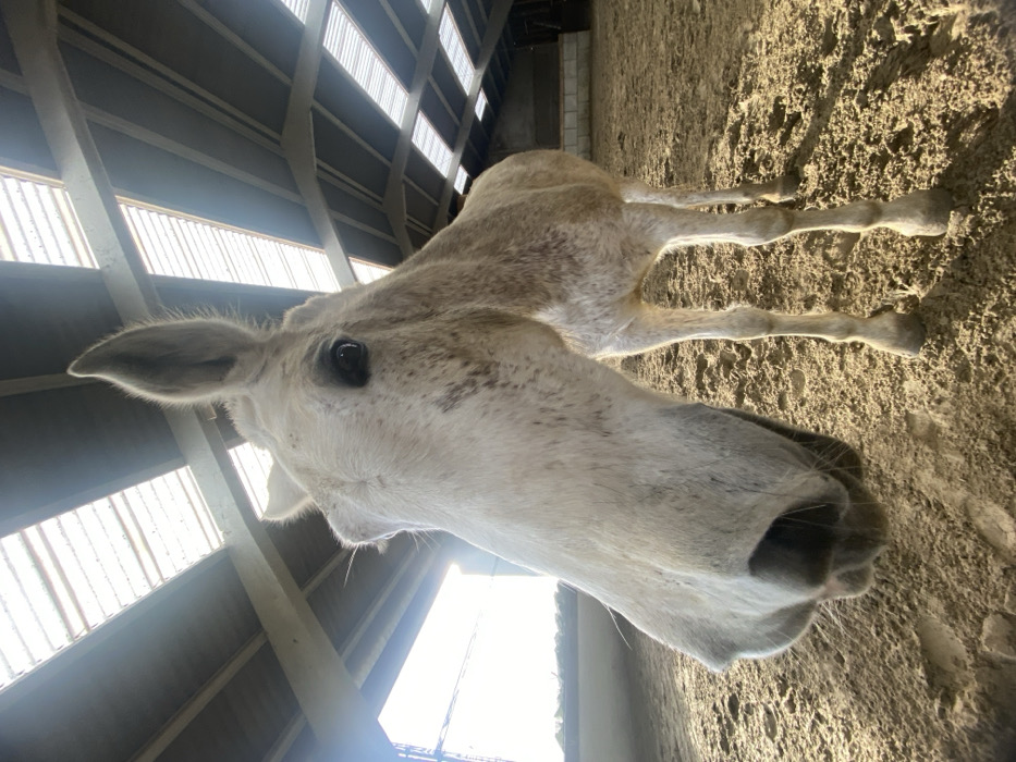 This image depicts a single equine subject, specifically a light-colored horse, positioned within an indoor equestrian arena in Estaimpuis, Belgium. The horse, appearing to be a white or light grey with scattered darker flecks, occupies the central foreground, with its head and muzzle presented in a wide-angle, close-up perspective, looking directly towards the camera. Its dark eyes are clearly visible, as are its upright ears. The horse stands on a sandy or dirt ground surface. The environment is characterized by a metal-framed roof structure with translucent panels allowing natural light to illuminate the interior, casting soft shadows. Visible structural beams support the roof. No other individuals or animals are discernibly present.