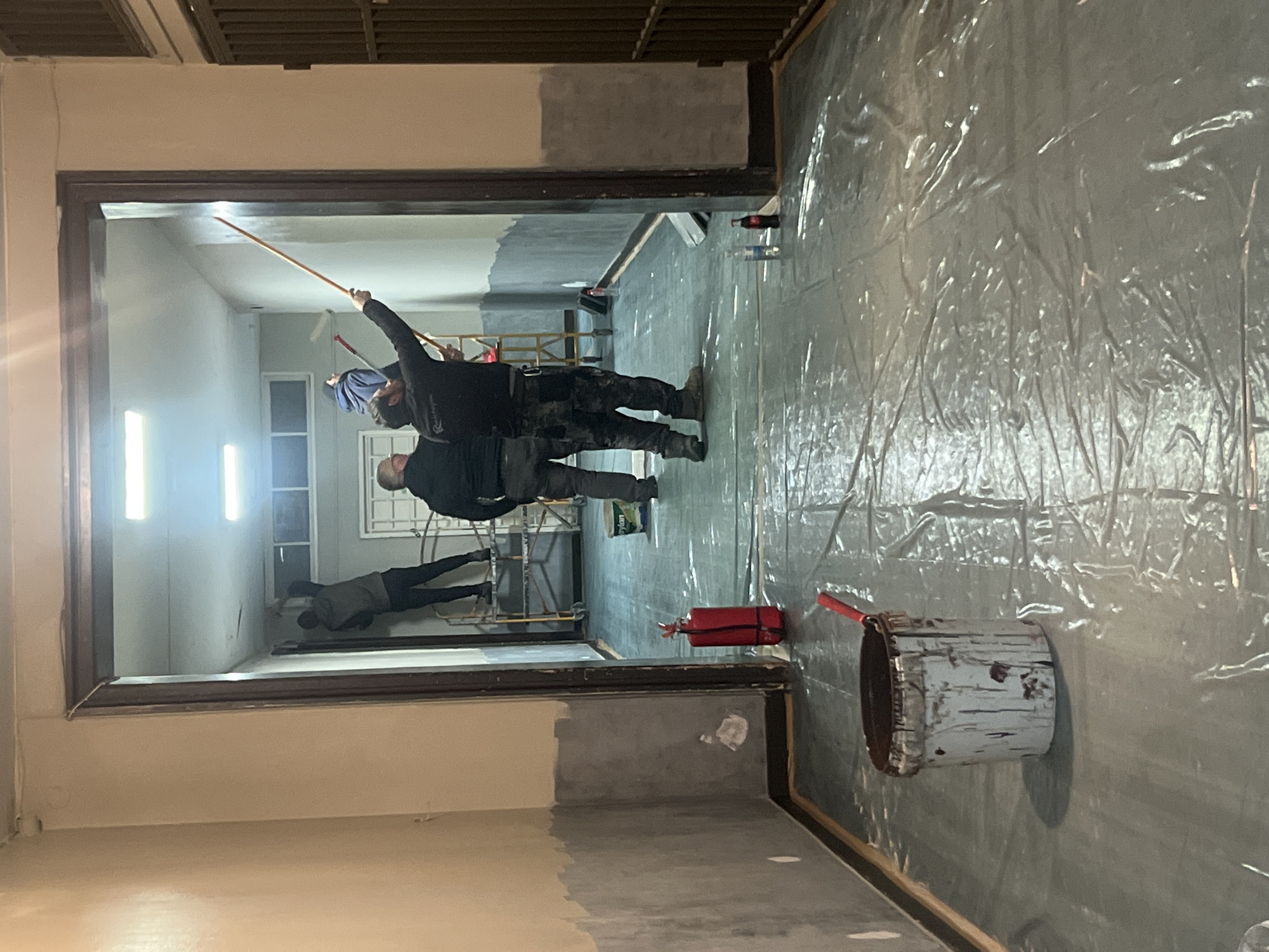 The image portrays an interior painting operation within a building corridor leading into a larger room