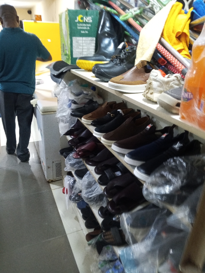 A man stands near shelves stocked with footwear. Boots, shoes, and sandals are displayed across multiple tiers. Some items are covered in plastic. A box of JCNS products is visible. Other objects like ropes and cloths fill the background. A refrigerator and orange drink bottle are also visible.