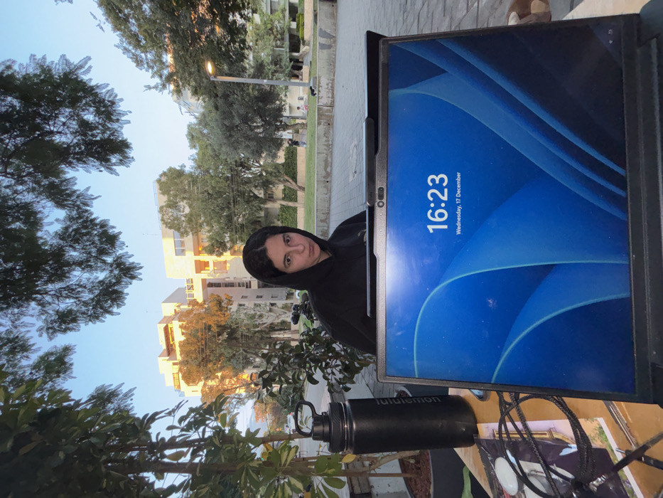 The image depicts an outdoor scene in Tel Aviv, Israel, capturing a person seated behind a laptop in what appears to be a public park or a paved area adjacent to residential buildings. In the foreground, a black laptop is open, displaying a blue screen with abstract wavy patterns. The digital clock on the screen reads "16:23," and below it, "Wednesday, 17 December" is visible. An external accessory, possibly a webcam cover or screen light, is attached to the top bezel of the laptop screen. To the left of the laptop, on a dark surface, a black Lululemon-branded water bottle with a carrying handle stands upright. Indistinct items, including a black cable or strap, are partially visible on the surface near the water bottle. In the midground, a person with dark, curly hair, wearing a black hooded sweatshirt with the hood up, is seated behind the laptop. They are looking directly forward, towards the viewer, with a neutral expression. Only their head and upper torso are visible above the laptop screen. The background features a clear, light blue sky above a landscape of green foliage and modern architecture. Numerous trees with lush green leaves frame the upper portion of the image and populate the park area. Several light-colored (beige or pale yellow) multi-story residential buildings are visible, illuminated by the warm, golden light of the setting or late afternoon sun, particularly on their facades facing the sun. A paved walkway transitions into a grassy area in the mid-distance. Two small, indistinct figures, likely children, are visible in the far distance within the grassy area. A street lamp stands upright on the right side of the grassy section. A dark object, possibly a small animal, is near the edge of the paved area on the right. Faint outlines of distant hills or mountains are visible on the far left horizon.