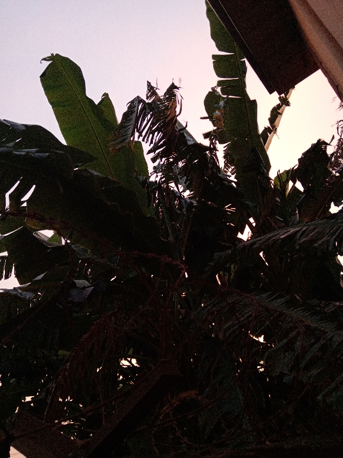 The image depicts a dense cluster of tropical foliage, primarily banana and palm trees, backlit against a pale, desaturated sky. The sky transitions from a faint lavender-pink at the top to a brighter, light yellow glow as it filters through the leaves. Dominant large, broad banana leaves, dark green in color due to backlighting, exhibit tearing, fraying, and dried sections along their edges and surfaces. Beneath and intertwined with these are darker, thinner, linear leaves consistent with palm fronds. Small pockets of intense white light penetrate the dense foliage in various locations. In the upper right corner, a dark, angular architectural structure, possibly part of a building's roof or overhang, is partially visible. No individuals or animals are present. The scene is located in the city of Unknown, Unknown, within a tropical or subtropical urban or suburban setting.