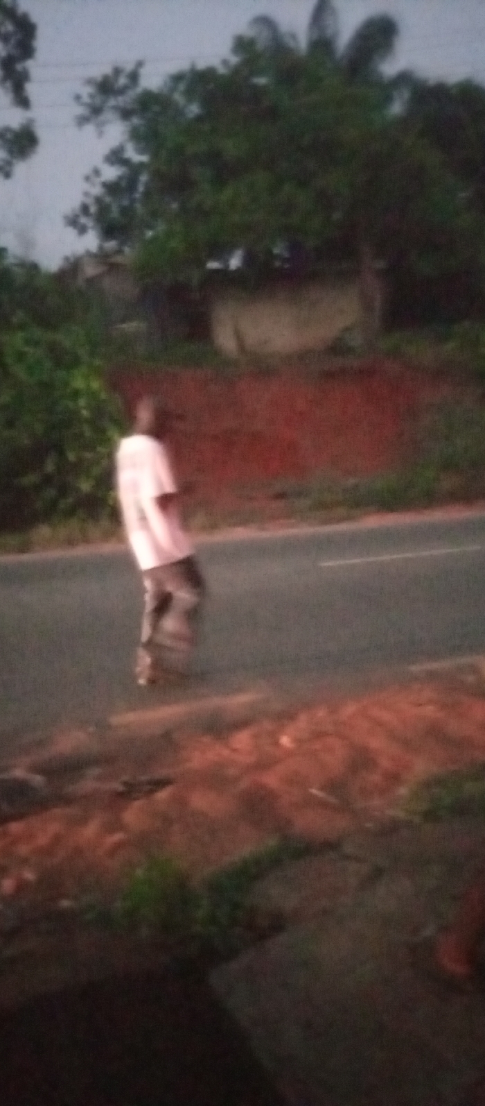 A blurry image shows a person walking along a road. The person is wearing a light-colored shirt and dark pants. The road is asphalt and has a shoulder. There is a red bank with vegetation behind the road. In the background, trees and a building are visible against a dusky sky. The foreground is dark and unclear, with indistinct ground cover. The overall image quality is poor, lacking clarity and detail.