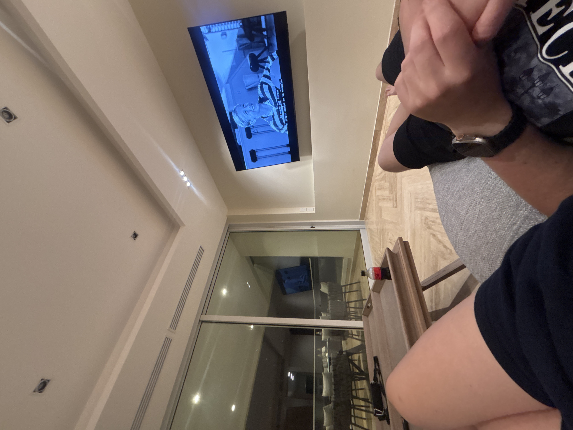 A person is sitting in a room with a TV mounted on the ceiling displaying a black and white image with Spanish subtitles. There is a sliding glass door leading to a patio with chairs and a table, suggesting a vacation rental or hotel room in Acapulco de Juárez, Mexico. The person has a watch on their left wrist. A small wooden table is located next to the chair. A bottle of Coca-Cola sits on the wooden table.