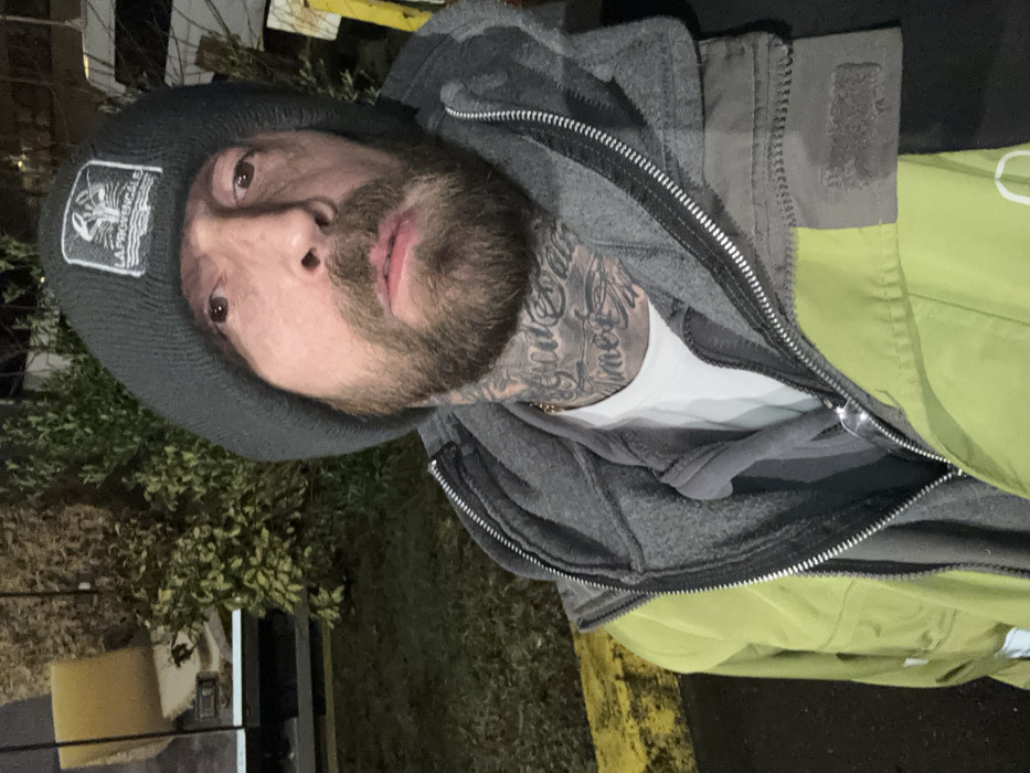 A close-up shot captures a man wearing multiple layers. He sports a dark beanie with a rectangular logo, a gray zip-up hoodie, a white t-shirt, and a green and gray jacket. He has a beard and a tattoo on his neck. The background includes some greenery and what appears to be a dimly lit outdoor setting.