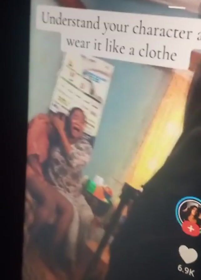 A screen recording of a TikTok video is shown. The video features a woman wearing a patterned blouse and pants, reacting with shock. She is holding a tray with colorful objects. Text overlays the video: "Understand your character and wear it like a clothe". The interface shows the TikTok "Following" and "For You" tabs, and timestamp "12:05 AM." The rest of the video's contents are obscured by the angle of the recording.