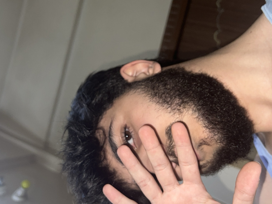 A person tilts their head, obscuring much of their face with a hand. A brown eye peers through the fingers. Dark, curly hair covers the head. A thick, short, dark beard covers the jaw and cheek area. A light-skinned ear is visible at the top. A hint of a light blue shirt is visible near the shoulder. The background includes a white wall and a dark brown wooden cabinet or door. A blurred object sits on a white surface in the distant background.