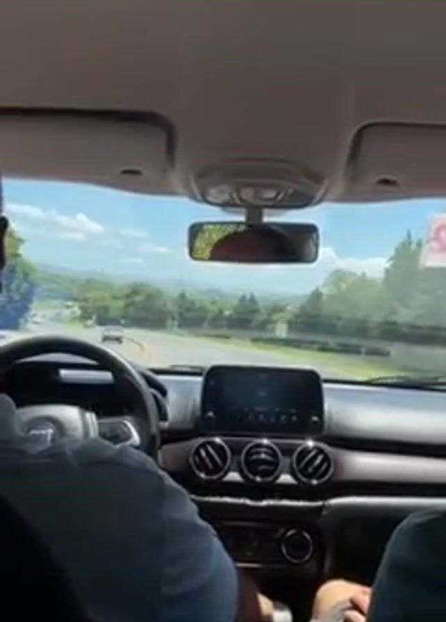 The interior of a car is shown, with the dashboard and front seats visible. A man is driving, and another person is seated in the passenger seat. The car is moving along a winding road, with trees and a distant landscape visible through the windshield. The steering wheel has a Fiat logo on it. The dashboard features a touchscreen display and circular air vents. The sky is blue with scattered clouds. There is a sign with red and white lettering visible outside the front passenger window.